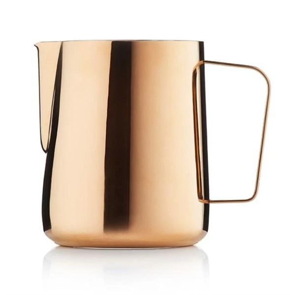 Dzbanek do spieniania mleka od Barista & Co, wykonany ze stali nierdzewnej w kolorze różowego mosiądzu.