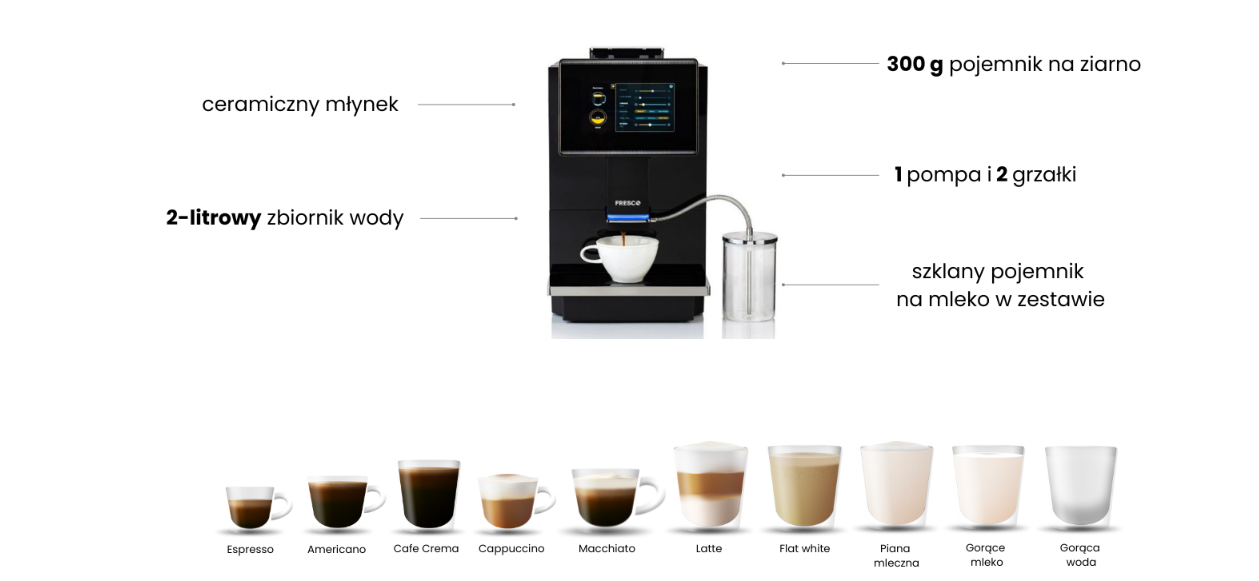 Fresco C11 to niezwykle eleganckie i nowoczesne urządzenie, które świetnie dopasuje się do każdego wnętrza, fronty wykonane z wysokiej jakości szkła zachwycają użytkowników swoją estetyką. Urządzenie posiada regulowaną wylewkę kawy od 10 do 14cm wysokości, przez co będzie doskonałe do kaw typu latte serwowanych w większych kubkach. Zasobnik na ziarna w ekspresie C11 ma pojemność 300g , jest to wystarczająca ilość aby pomieścić Twoje ulubione ziarna kawy tak aby szybko nie wywietrzały, a cichy ceramiczny młynek doskonale je zmieli. Dzięki regulacji w ekspresie można dostosować różne parametry do swoich potrzeb. W ustawieniach można zmienić długość wstępnego zaparzania, temperaturę czy stopień zmielenia ziaren oraz ilość mleka, tak aby stworzyć napój idealnie spersonalizowany dla użytkownika. Dzięki zaawansowanemu systemowi podgrzewania i napowietrzania mleka, możesz cieszyć się puszystą i kremową pianką, która doskonale uzupełnia smak Twojego napoju, jednocześnie zachowując naturalny smak mleka.