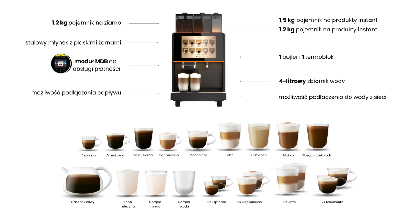 Ekspres do kawy Fresco X580 to najnowszy i najbardziej zaawansowany technologicznie model z ekspresów automatycznych. Został dostosowany do nawet najbardziej wymagających potrzeb klientów, jego dzienna wydajność to ok. 300 kaw. Urządzenie zostało zaprojektowane z myślą o dużych przestrzeniach biurowych, punktach gastronomicznych, hotelach, restauracjach i stacjach benzynowych. Fresco X580 zapewnia najlepszej jakości napoje za jednym kliknięciem oraz doskonałe wrażenia z korzystania.
