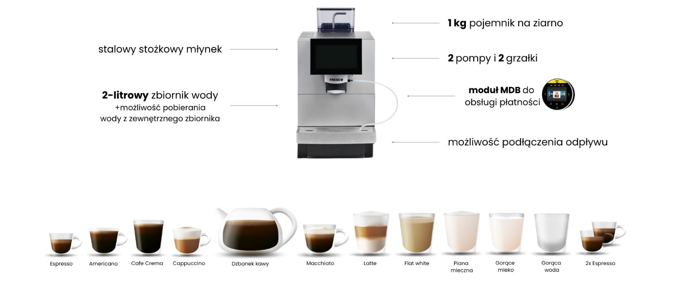 Połączenie nowoczesności i wydajności w jednym – tym cechuje się ekspres Fresco X80. Najnowsze urządzenie z tej serii, które doskonale wpasuje się do każdego wnętrza. Jego prosta, a zarazem niezwykle elegancka obudowa będzie idealnym elementem i wyposażeniem restauracji, hoteli oraz przestrzeni biurowych i lokali usługowych.