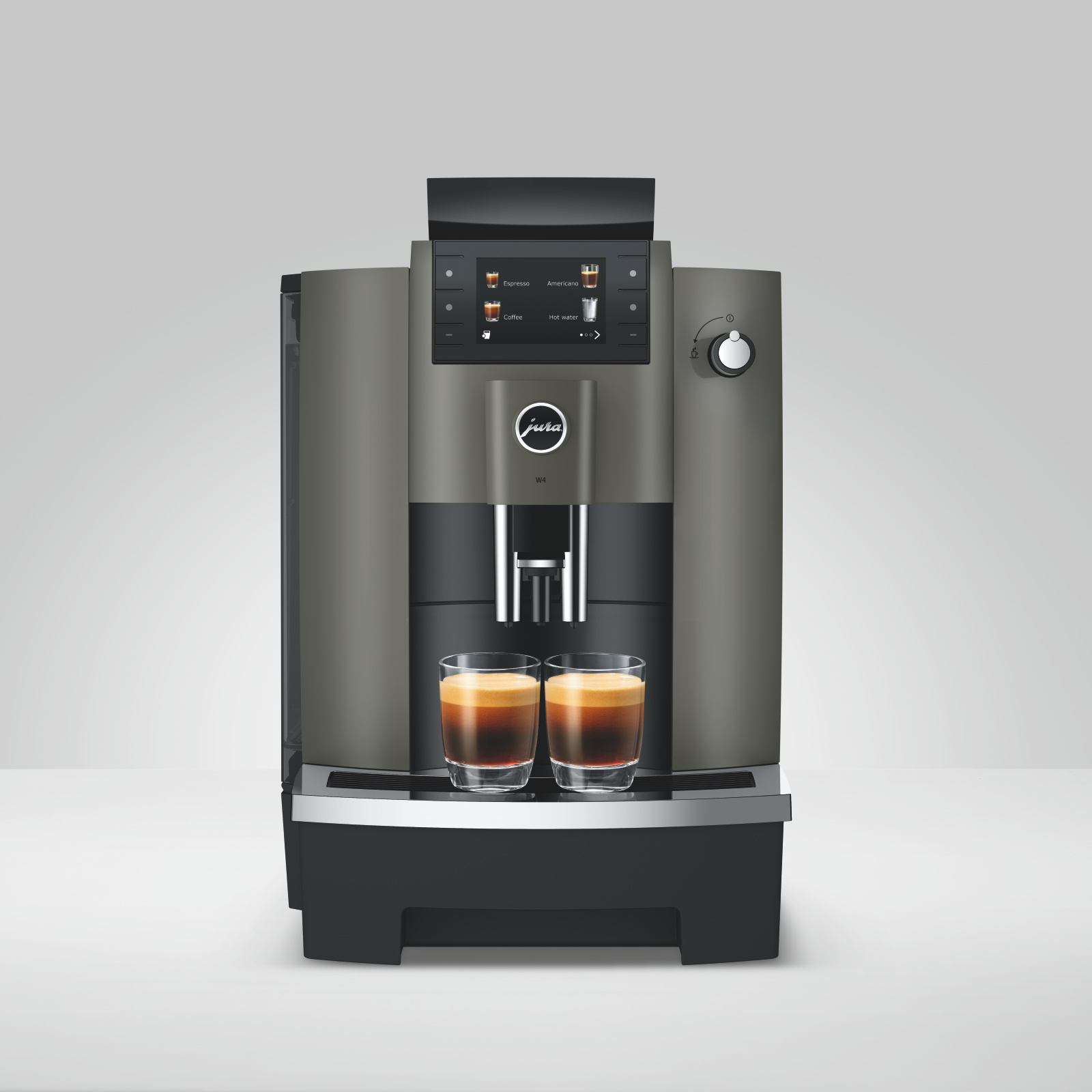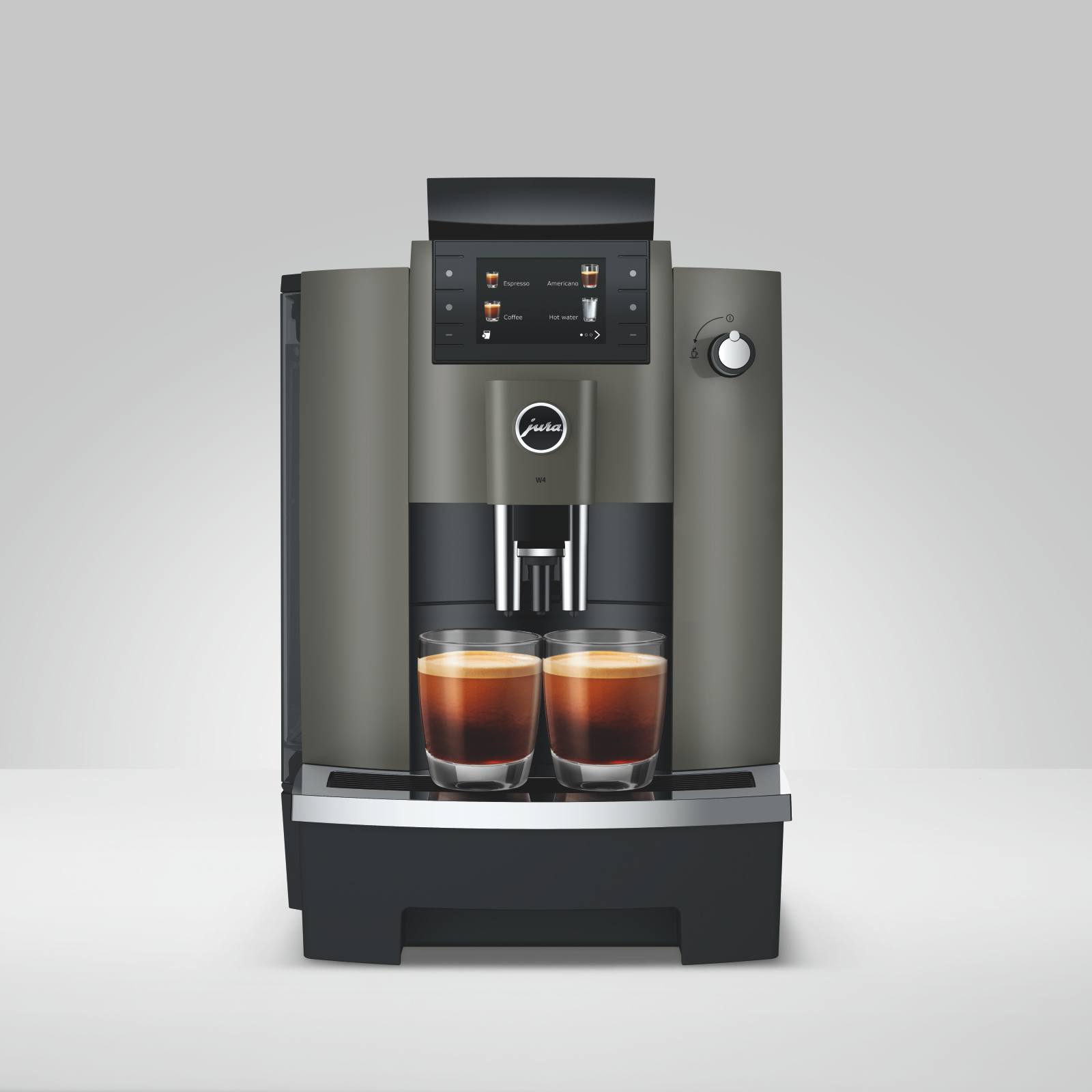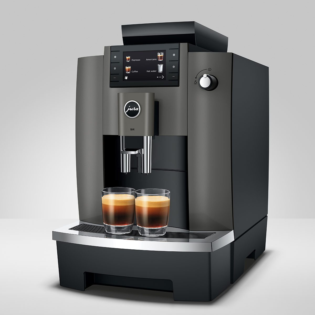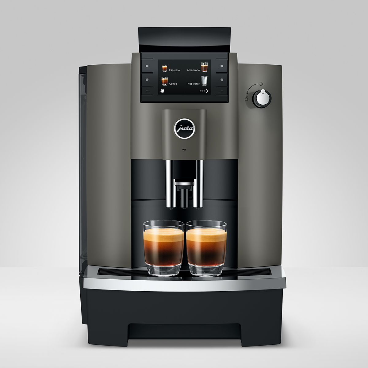 Pulsacyjnej (P.E.P.®) do intensywnego espresso. Design nawiązuje do funkcjonalności i klasycznej elegancji JURA. Dzięki kolorowemu wyświetlaczowi, umieszczonym z przodu przyciskom i przełącznikowi do przygotowywania gorącej wody, W4 jest niezwykle przyjazny dla użytkownika. Nienaganna higiena za naciśnięciem przycisku i zamykane elementy zapewniają łatwą obsługę. Podczas gdy czyste linie W4 zapewniają ponadczasową estetykę, programowanie oferuje niezbędny zakres elastyczności. Ilość zmielonej kawy i wody, a także opcje blokady, można regulować na różne sposoby. Dzięki 3-litrowemu zbiornikowi na wodę i pojemnikowi na kawę ziarnistą o pojemności 500 g, ekspres W4 idealnie nadaje się do miejsc, w których wymagana jest dzienna wydajność do 50 kaw czarnych specjałów.