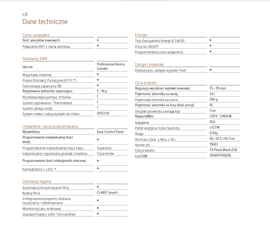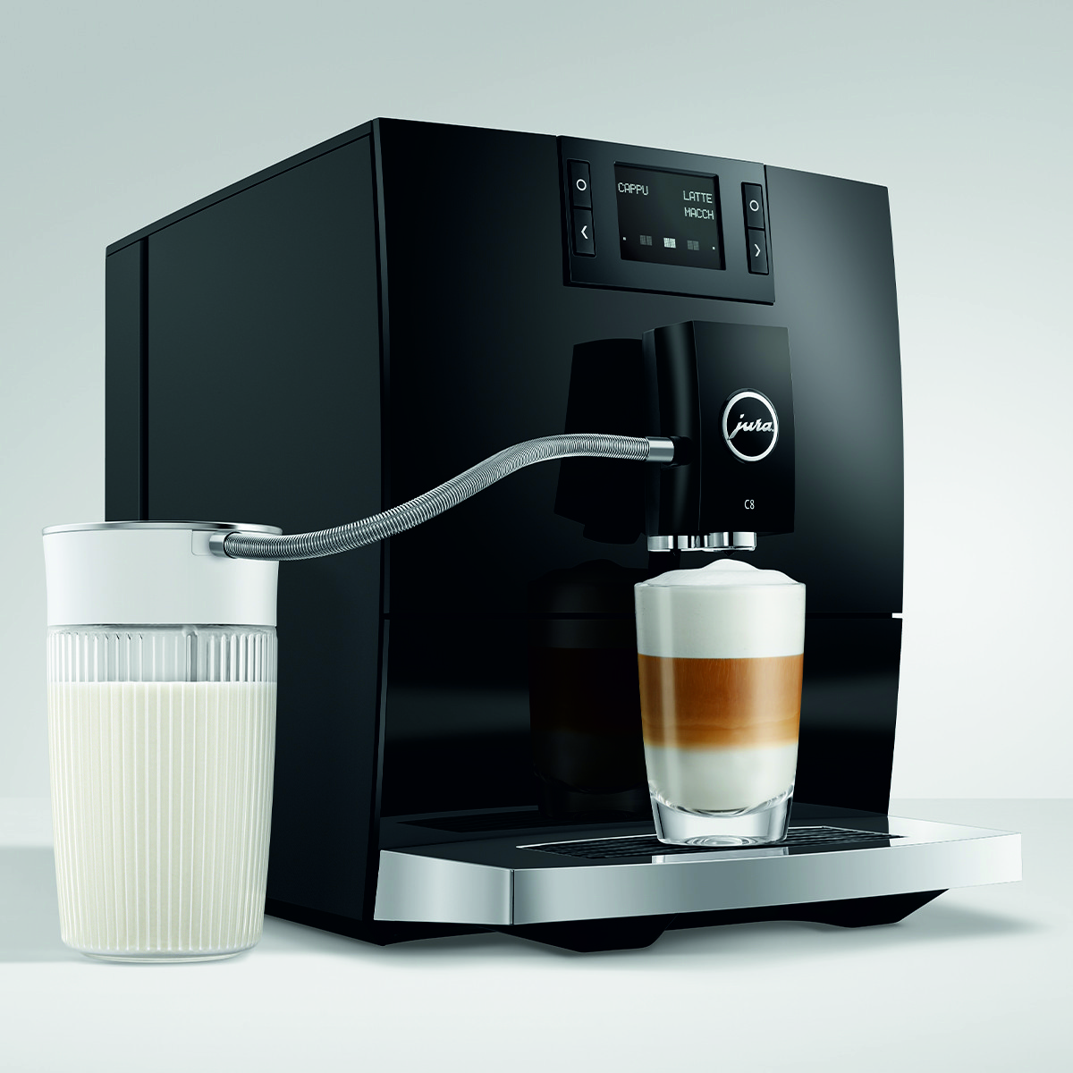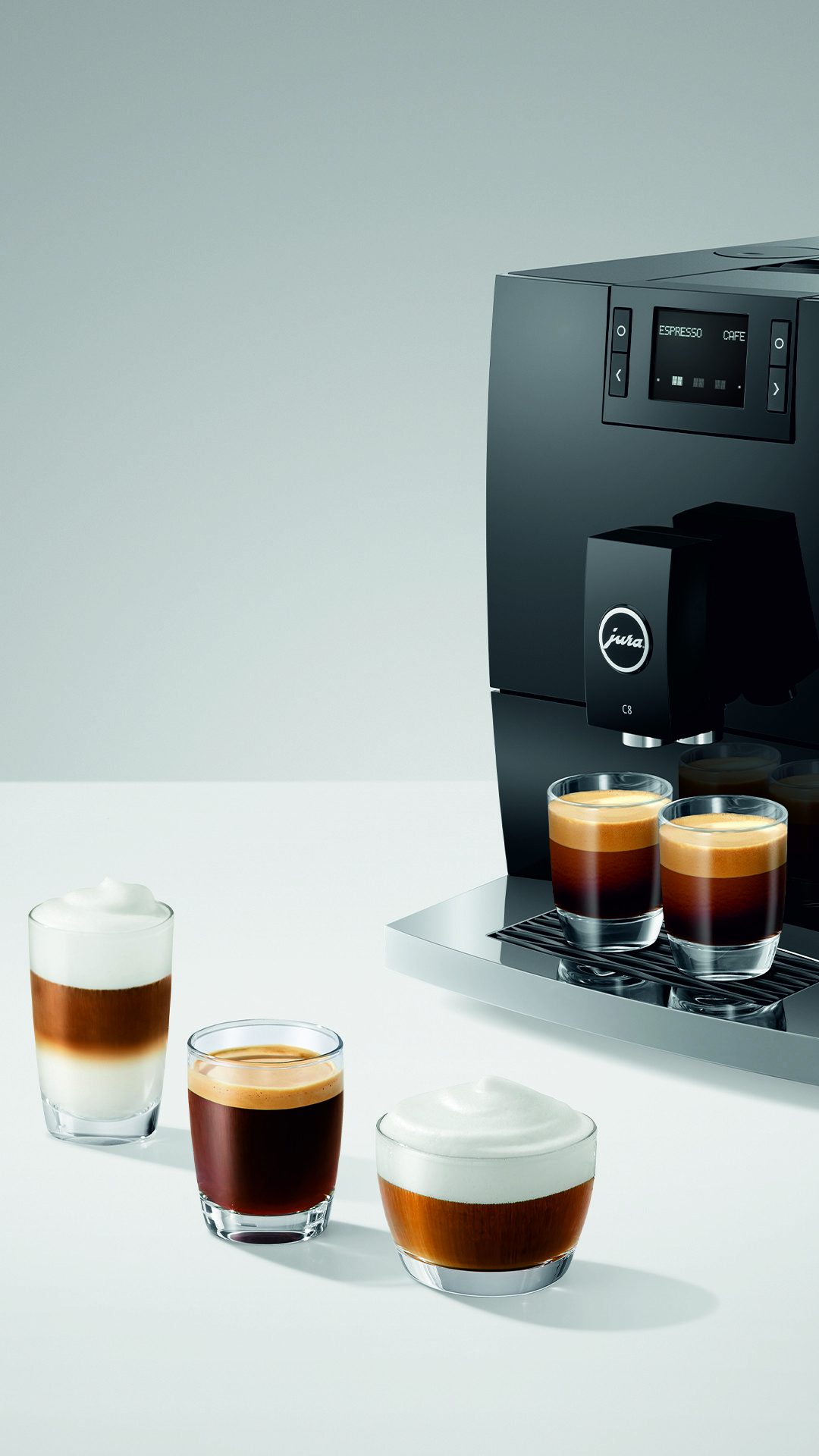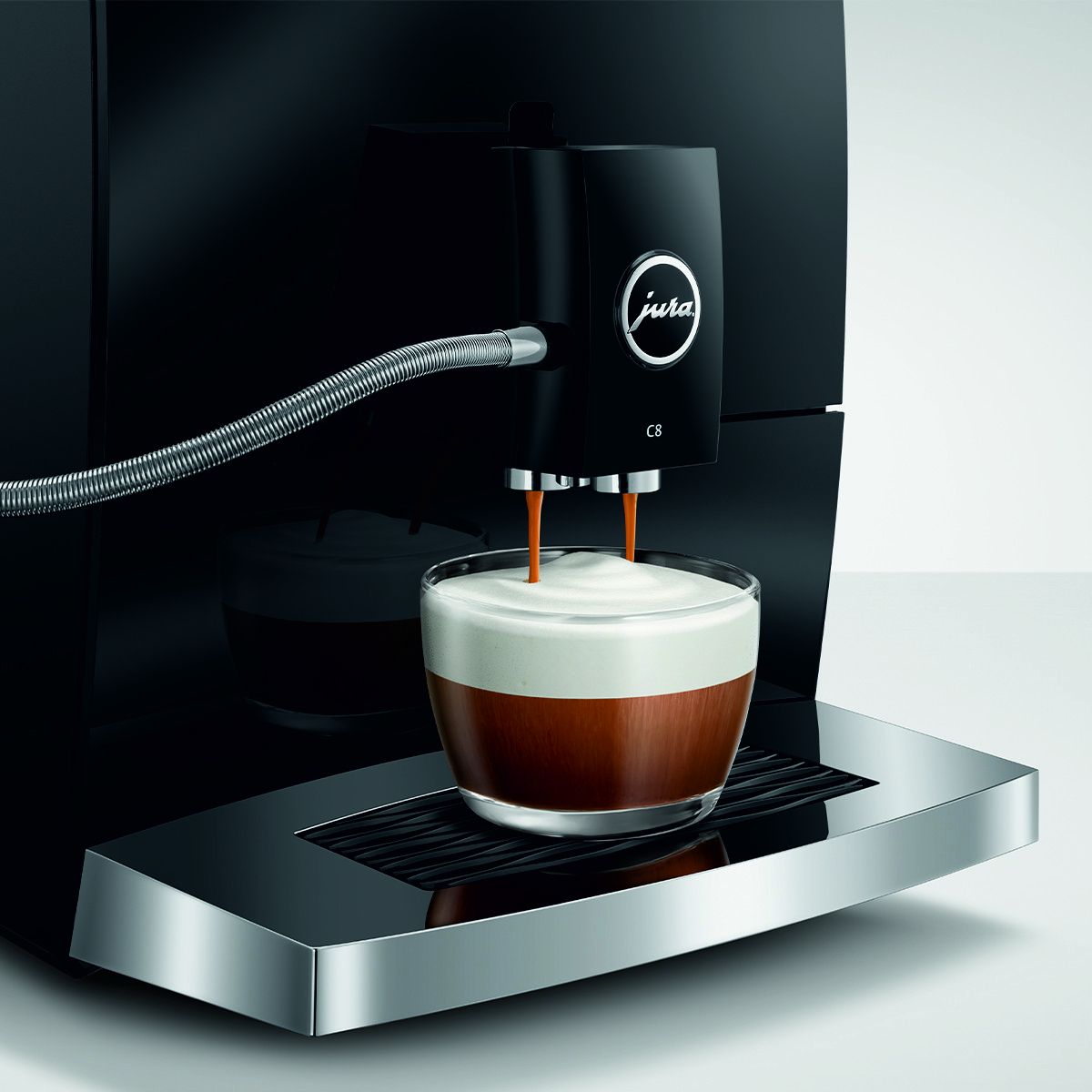 Model C8 reprezentuje nowy segment premium economy firmy JURA. Kompaktowy ekspres, który zapewnia maksymalną wydajność, zaprojektowany i wyposażony w elementy charakterystyczne dla segmentu premium, serwujący niezapomniane doznania kawowe.