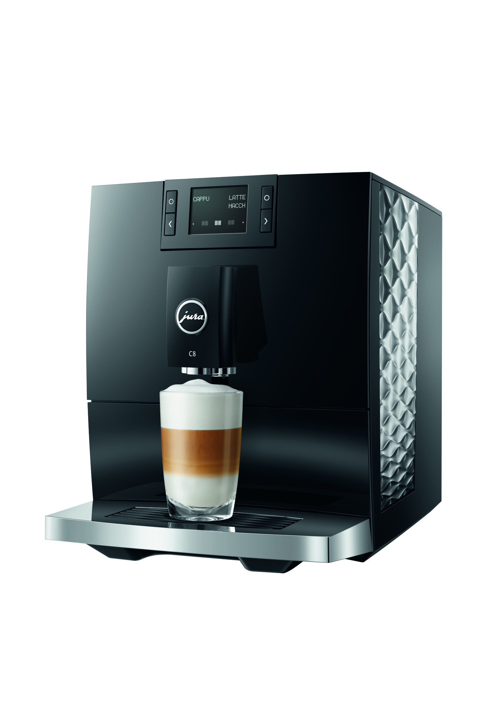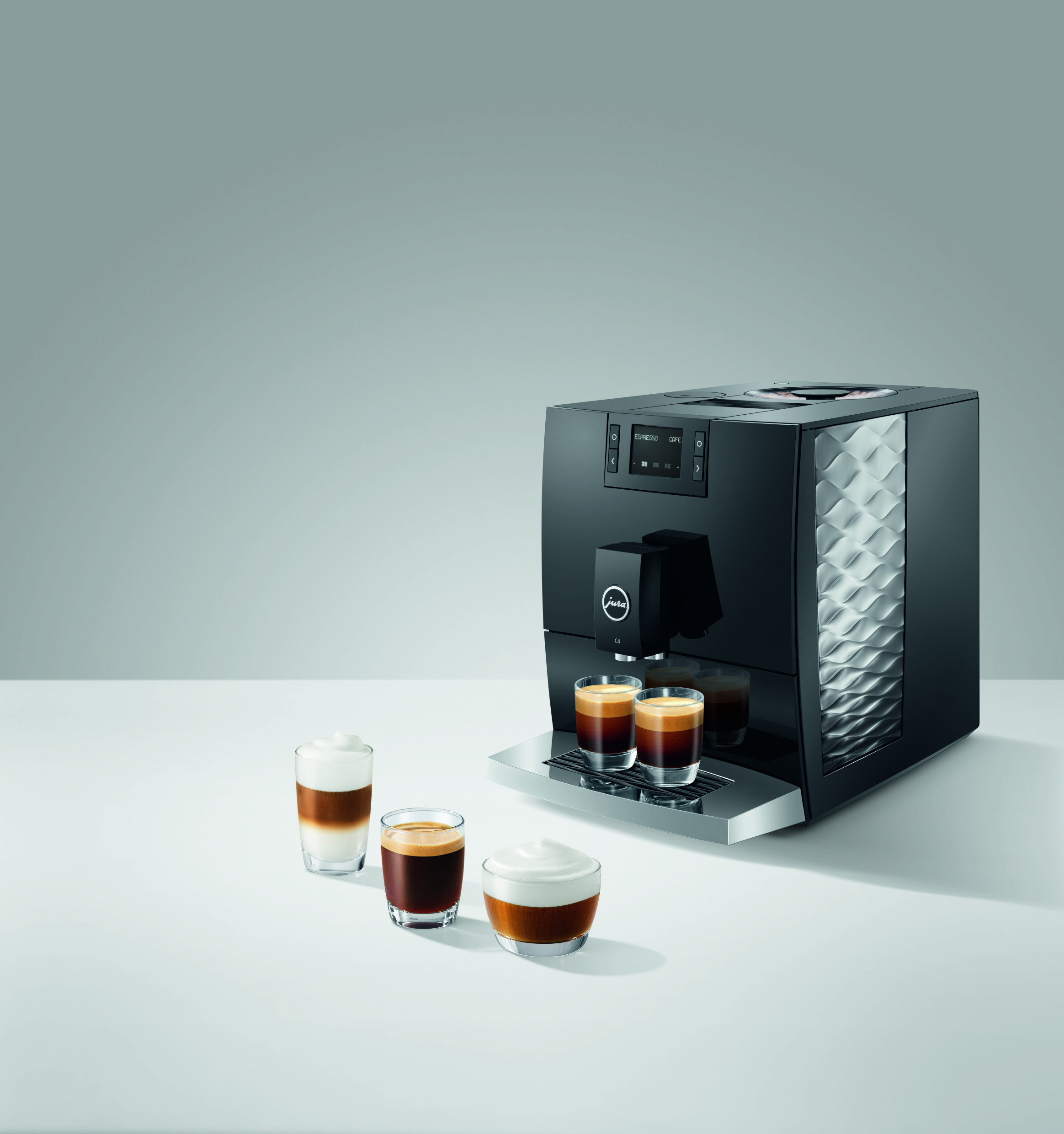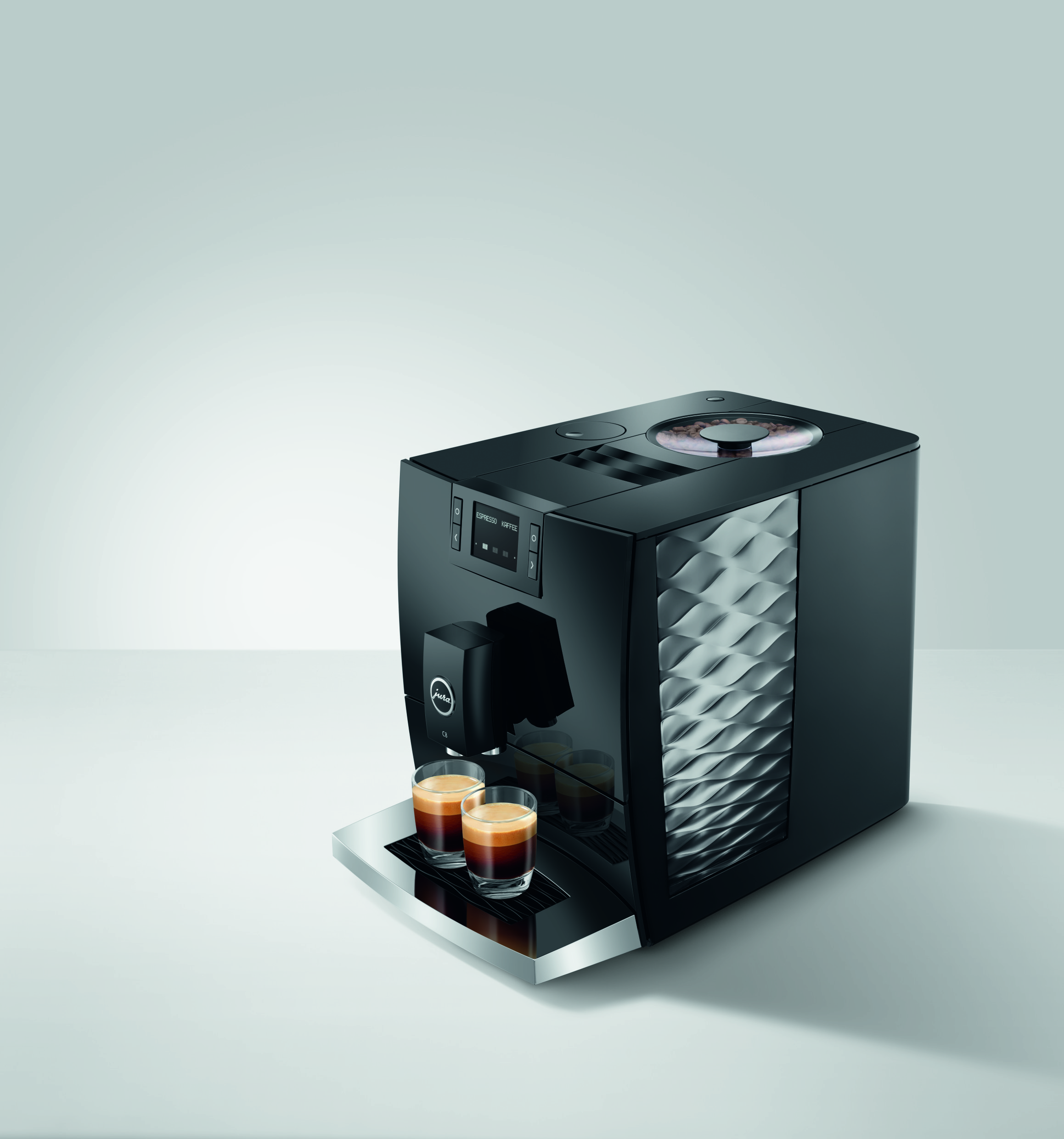 Imponujące wypukłe i wklęsłe linie ekspresu C8 wizualnie odzwierciedlają jego cechy charakterystyczne dla segmentu premium. Intuicyjny panel sterowania Easy Control oraz przyciski zapewniają prostą i wygodną obsługę. Wraz z Wi-Fi Connect i aplikacją J.O.E.®, C8 może być obsługiwany za pomocą smartfona lub tabletu i oferuje szereg dodatków, które przenoszą doświadczenie użytkownika na wyższy poziom.