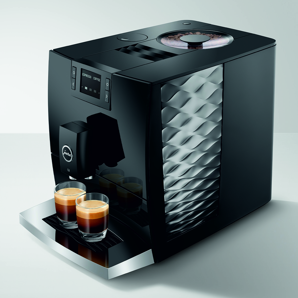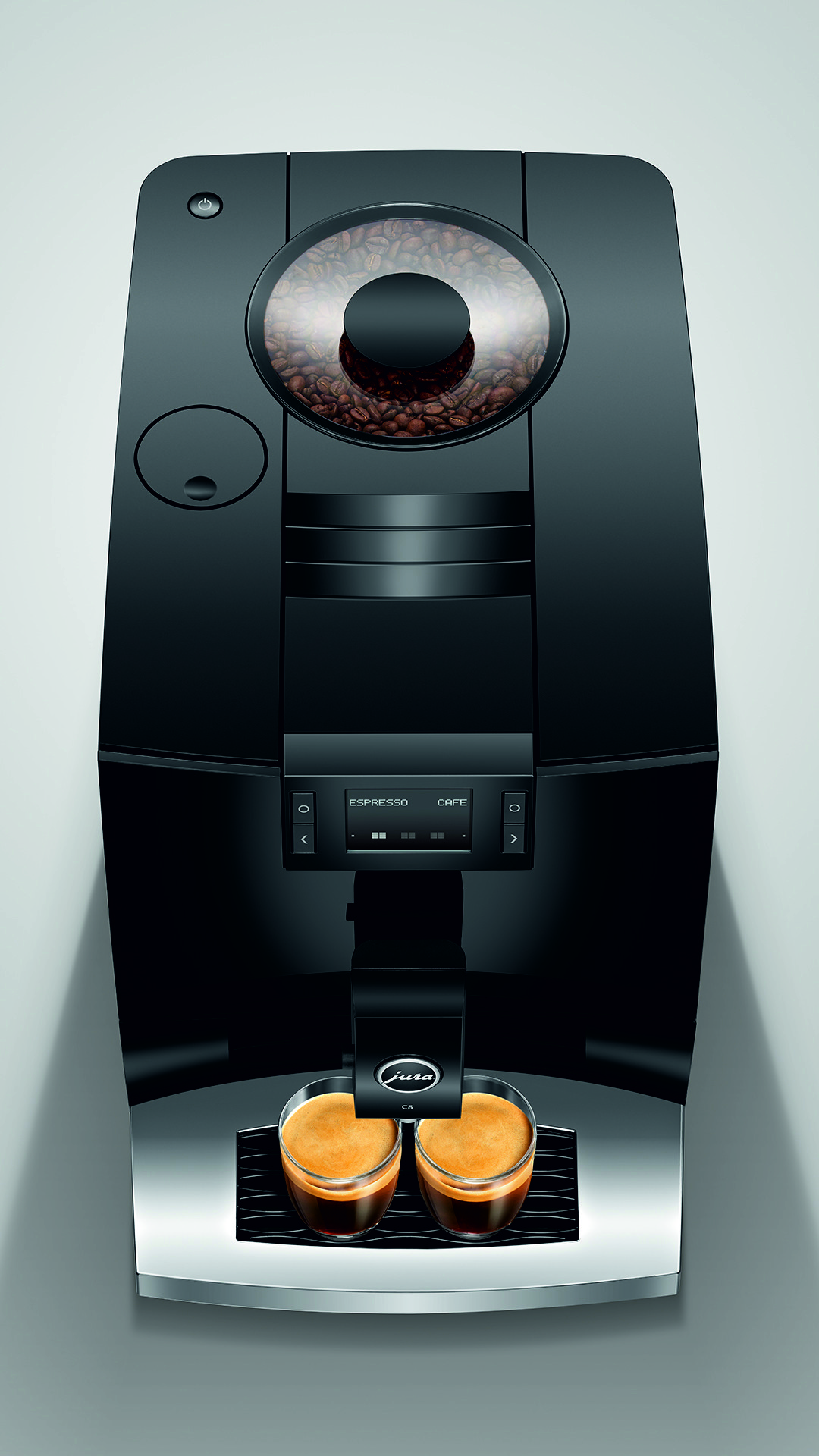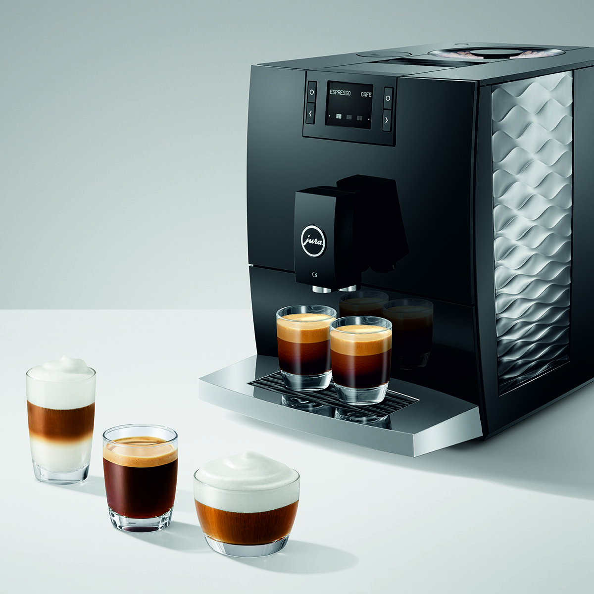Imponujące wypukłe i wklęsłe linie ekspresu C8 wizualnie odzwierciedlają jego cechy charakterystyczne dla segmentu premium. Intuicyjny panel sterowania Easy Control oraz przyciski zapewniają prostą i wygodną obsługę. Wraz z Wi-Fi Connect i aplikacją J.O.E.®, C8 może być obsługiwany za pomocą smartfona lub tabletu i oferuje szereg dodatków, które przenoszą doświadczenie użytkownika na wyższy poziom.