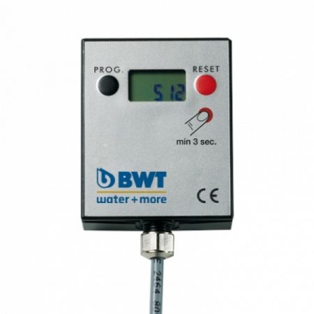 Licznik przepływu wody z wyświetlaczem LCD. Licznik, po podłączeniu do głowicy, zapewnia dokładny pomiar ilości wody, której użyliśmy. Po podłączeniu licznika należy zaprogramować go zgodnie z wydajnością filtra – na wyświetlaczu na bieżąco będzie wyświetlany stan licznika, aż do momentu jego wyzerowania. Urządzenie jest zasilane baterią CR2032.