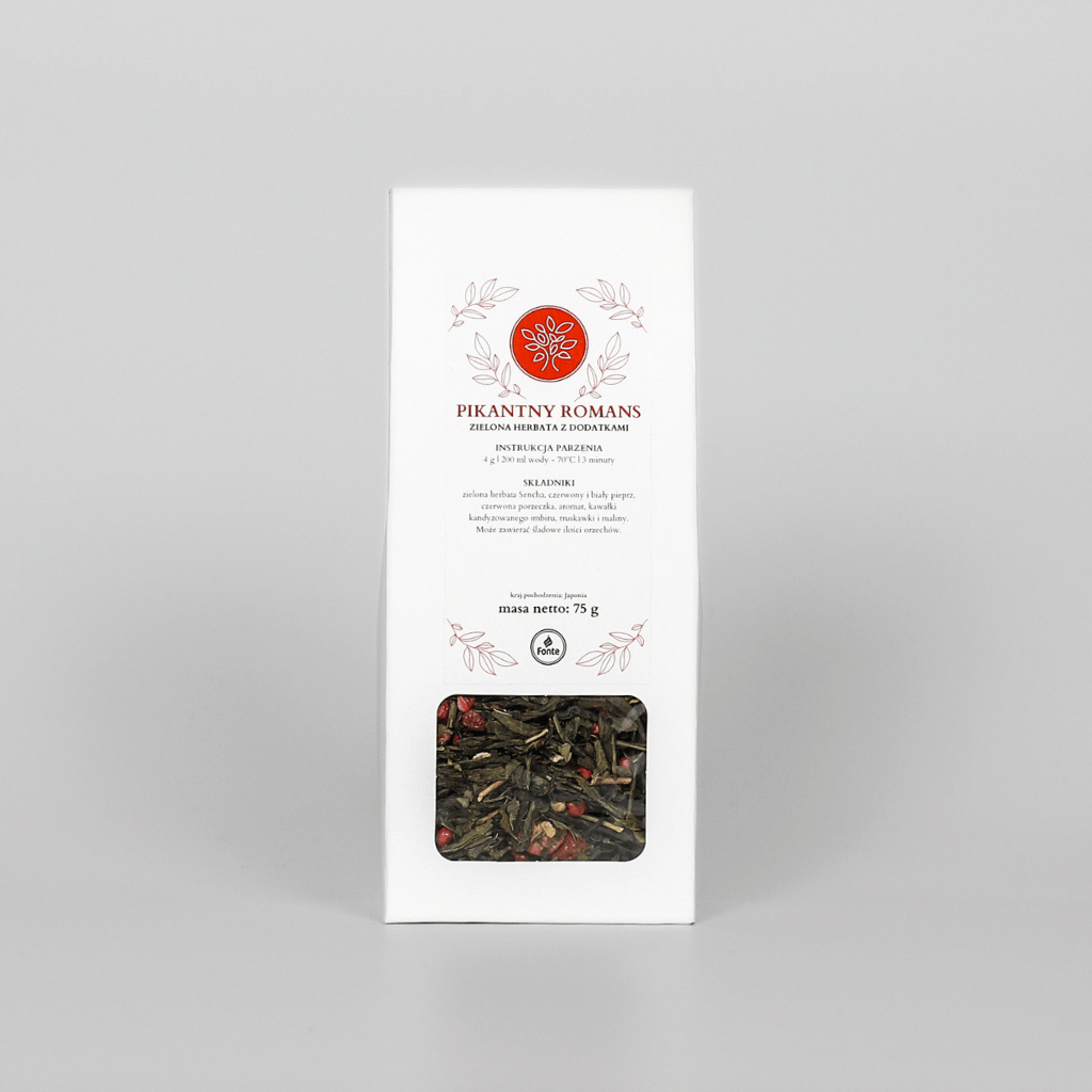 Pikantny Romans — jest to ciekawa kompozycja na bazie zielonej herbaty Sencha. To, co wyróżnia tę mieszankę spośród innych, jest jej pikantny smak. Odrobina pieprzu czerwonego i białego nadają całości niecodziennego charakteru.