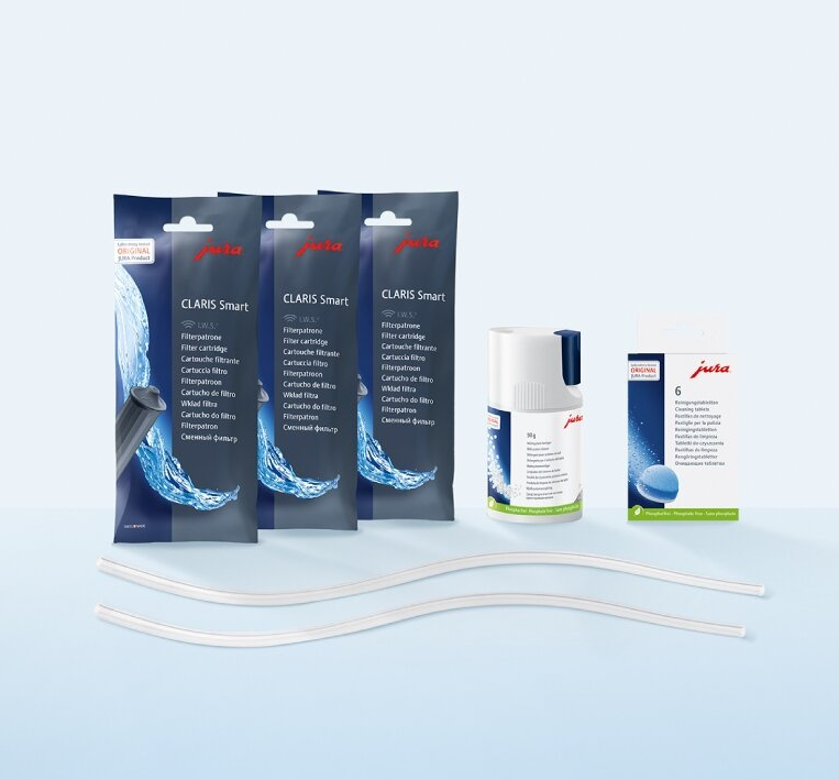 Zestaw Care Kit zawiera wszystkie niezbędne produkty do pielęgnacji. Zestaw Care Kit zawiera 3 wkłady filtrujące CLARIS Smart +, 1 mini tabletkę do czyszczenia systemu mleka, 6 tabletek czyszczących i 2 rurki na mleko.