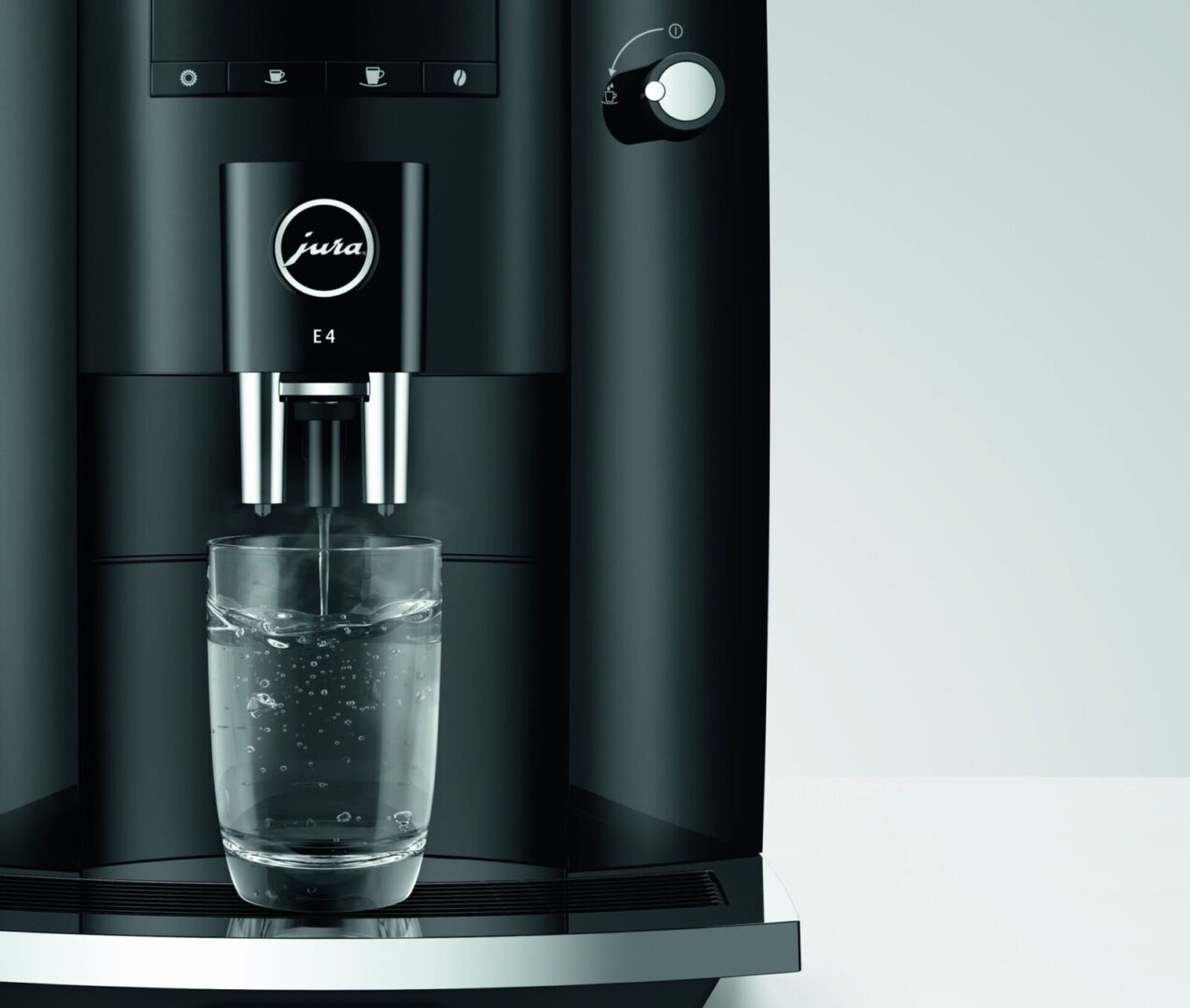 E4 doskonale sprawdza się zwłaszcza w przypadku specjałów z czarnej kawy. Profesjonalny młynek Aroma, jednostka zaparzająca 8. generacji i proces parzenia 3D gwarantują pełnię aromatu kawy. Oczywiście zawsze świeżo mielonej, nie z kapsułki. Do wyboru są trzy poziomy intensywności. Intuicyjny wyświetlacz symboli za naciśnięciem jednego przycisku prowadzi bezpośrednio do celu. Przygotowanie gorącej wody stanowi dopełnienie wszystkich funkcji ekspresu automatycznego.
