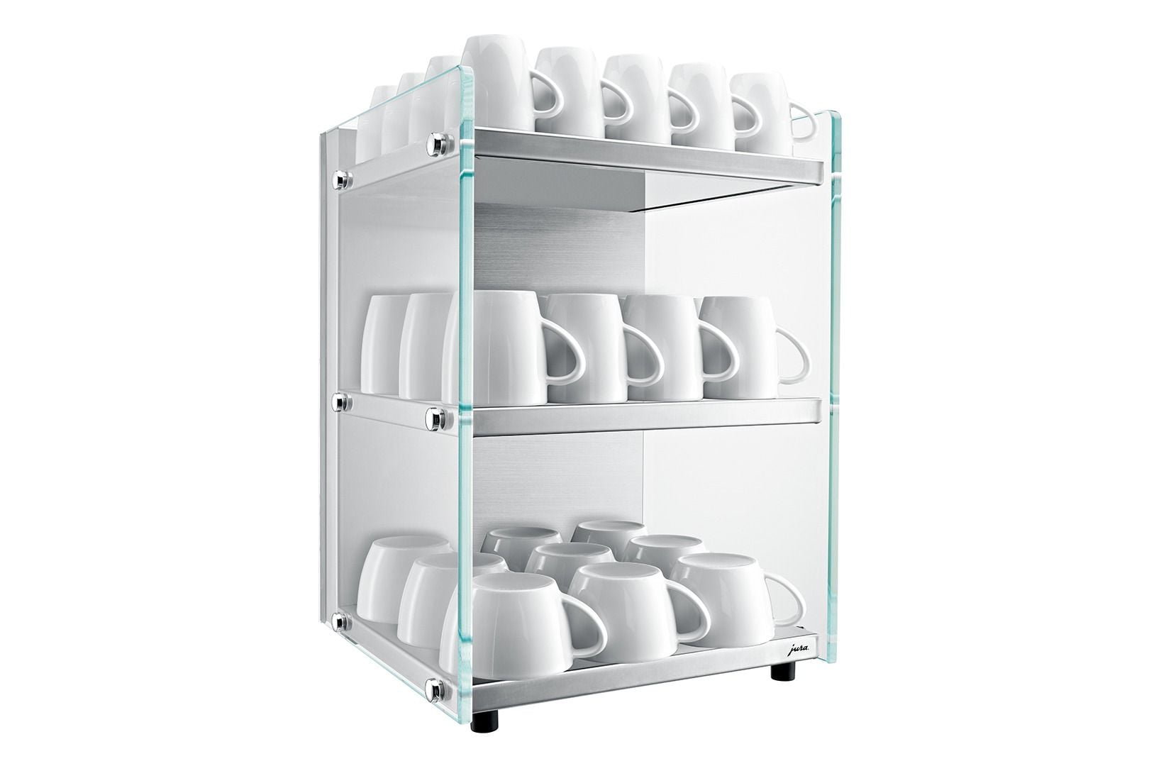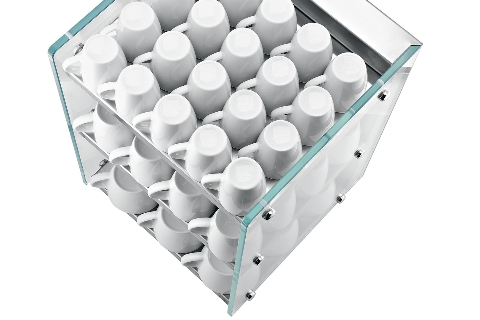 Podgrzewacz do filiżanek wykonany ze stali szlachetnej, wykończony wysokiej jakości elementami z białego szkła, swoją lekką formą doskonale współgra ze wszystkimi modelami GIGA Professional oraz X8/X6.