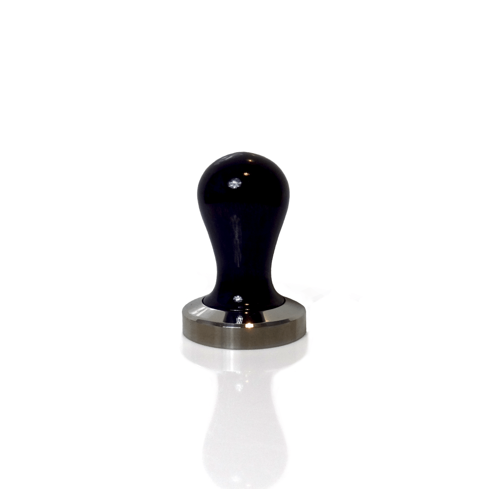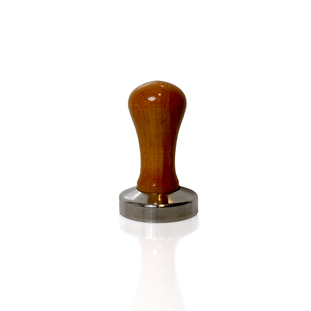 Ręcznie wykonany stalowy tamper z lakierowanym drewnianym uchwytem.