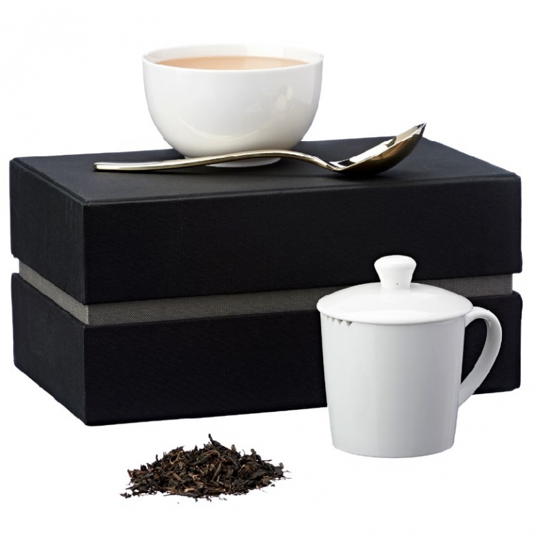 Biały zestaw do degustacji składający się z miseczki do degustacji, czajniczka do zaparzania z pokrywką i łyżeczki.